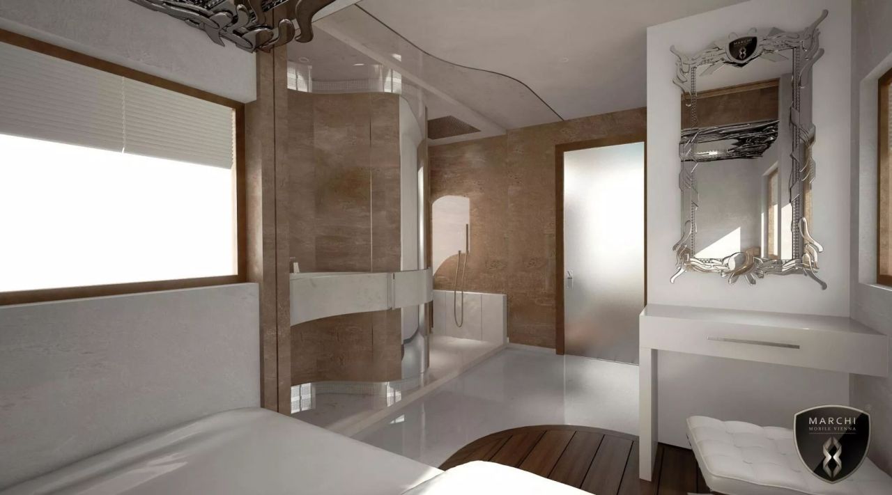 There are also several multimedia features including AC, radiant floor heating, two power generators, onboard media server, two 42-inch LED screens, wireless satellite TV, ambient light control, two Steinway & Lyngdorf audio systems and a central bus control system.