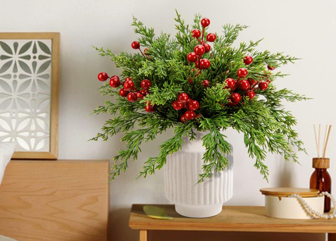 Do you need something to match your vintage Christmas setting? Then this artificial pine branches with red berry stems will supersede your expectations. The combination of berries and pine branches look elegant and evergreen, adding a charming visual accent.