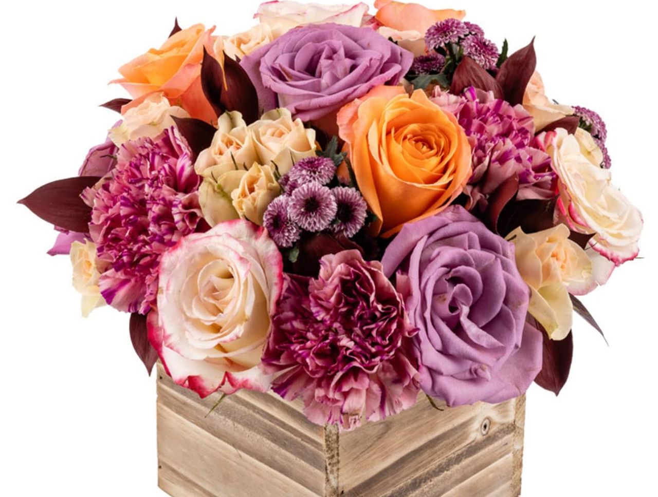 Here’s another cluster of fresh flowers with 24 cheerful stems in yellow, peach, lavender, red, and green. Bursting with joy, this fresh flower bouquet is perfect for celebratory occasions, like Thanksgiving and Christmas.