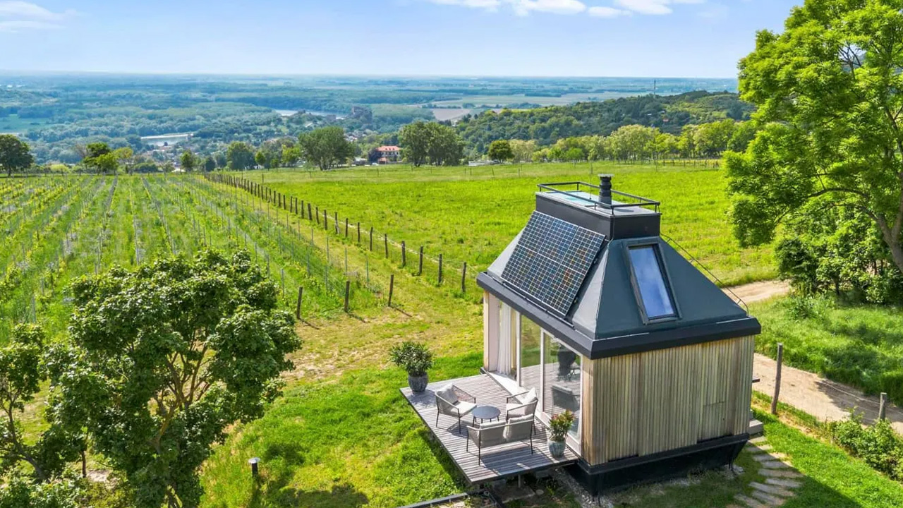 Located on the edge of the Zlatý Roh vineyards, Cabin Devín stands out with its remote location and modular prefab architecture. It is a self-sufficient holiday cabin developed by Ark-Shelter, which was named one of the best prefab home manufacturers in 2023. Developed in collaboration with Archekta studio, this studio is designed to blur the boundary between the interior and the surrounding landscape.