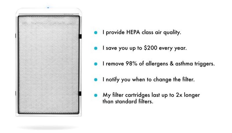 ALVI uses replaceable low-density filter cartridges that allow the air to circulate freely, allowing the home to heat up and cool faster. They work longer than an average filter, lasting between four to six months. This smart air filter can be controlled with a companion mobile app. It also works with Amazon Alexa, Google Home, Nest, and EcoBee.