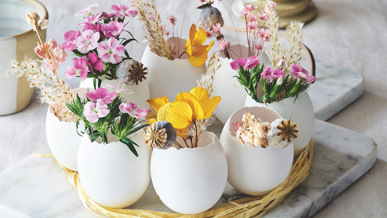 There are plenty ways to use eggs to create captivating egg décor display that fits within the budget. Let’s dive into the Homes & Gardens tutorial to learn how to make your own floral centerpiece.