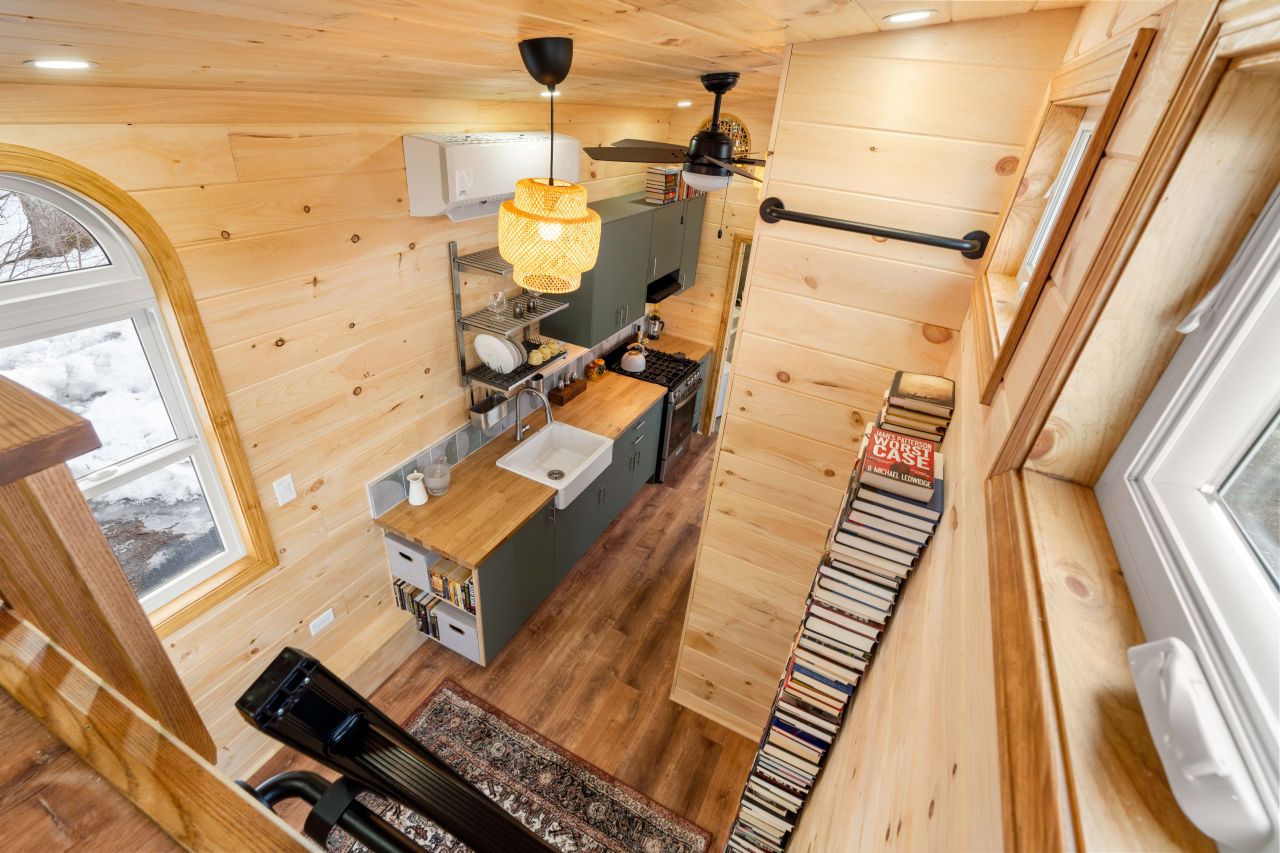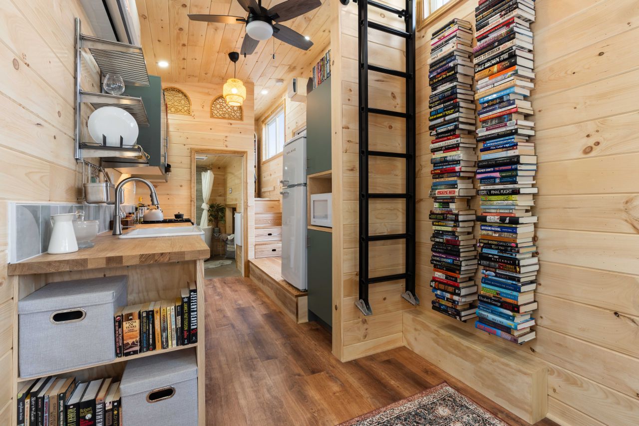 Beyond its book-centric design, the Library tiny house boasts a light-filled layout that maximizes comfort and functionality. The tiny house has large windows that flood the interior with natural light, while creating an airy and inviting atmosphere. Other spaces include a living room that’s compact yet welcoming, with room for a small sofa and clever storage solutions that keep the space uncluttered.