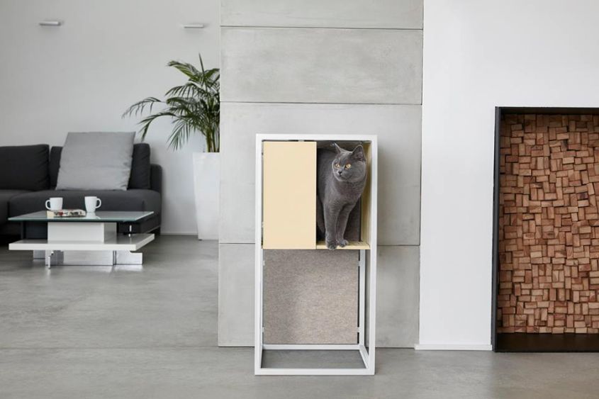 Made of a powder-coated aluminum frame combined with a clear lacquered light ash wood, the Albergo modular cat tree is not only supposed to meet contemporary interior design standards, but also to fulfill needs of cats. Each cubic unit features a half-cut design, which not only provides cats with a private protected space but also allows them having a full glance of their kingdom.