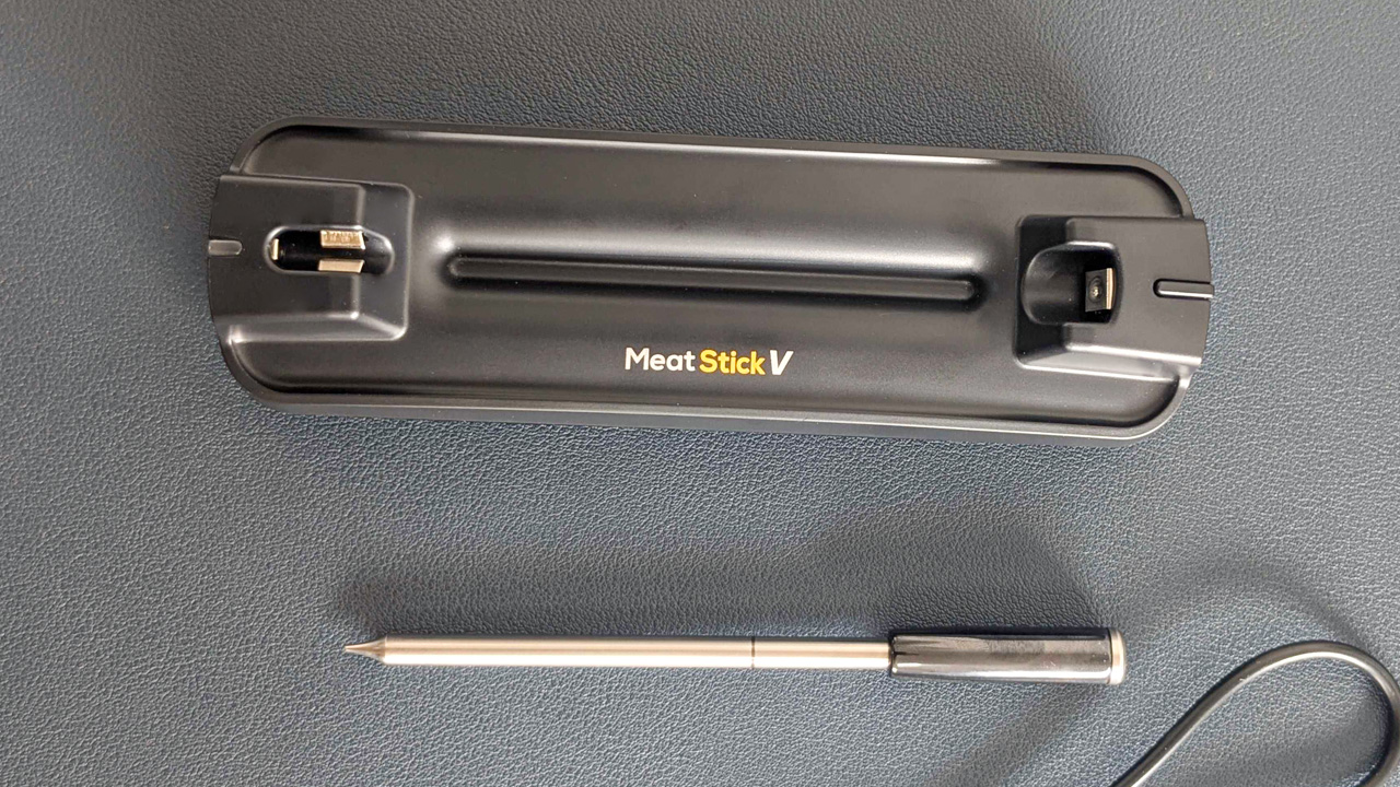 The MeatStick V comes in a neat little box. It looks like an unassuming pen, not just the box design, but the probe itself, too. You get four things inside the packaging: a base with the probe resting inside, a charging cable, and a user’s manual. The Smart Base is shy of 6 inches and sticks to your refrigerator or smoker thanks to its magnetic bottom. The probe measures 4.8 long and 0.5mm in diameter. There is a power button at one end of the base, and an LED light on the other with a Type-C port beneath it to charge the device.