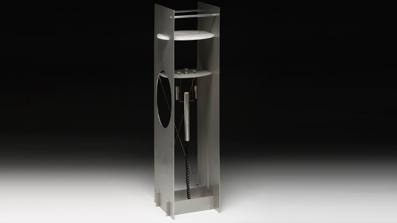 Each sculptural lamp is composed of stainless steel panels, nautical tensioners, pulleys, and counterweights, a light source, an onyx diffuser, and a glass sphere reflector. These elements form a visible mechanical system inside the structure outfitted between two steel panels with shelves to attach components. The light source moves up and down through a double-pulley mechanism, which controls the way light reacts.