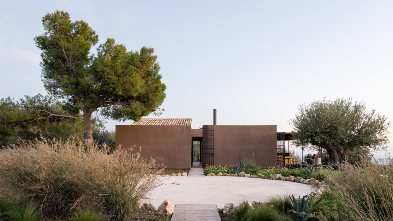 The new modern extension complements the original stable with its earthen Brown Cocciopesto cladding made with a mix of lime-based mortar with crushed brick, matching the surrounding carob trees and soil of Sicilian countryside. The primary function of the new extension was to provide modern amenities, which the original stable lacked.
